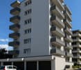 • Modern white apartment building, multiple levels, large blue balconies, greenery around, mountain in background