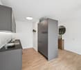 • Open-concept living space with hardwood floors, white walls, and modern kitchen cabinets. The kitchen features built-in appliances and a counter island. There is a closet space visible near the entrance.