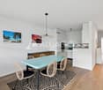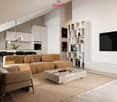 • The image shows a spacious open-concept living area with a kitchen and living room. The room has a modern, minimalist design with white walls, hardwood floors, and large windows that let in plenty of natural light. The kitchen features sleek, light-colore
