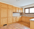 • Spacious kitchen with white cabinets, tiled backsplash, and a balcony with a view