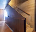 • hallway, bathroom with sink, mirror, and wooden shelf in the hallway