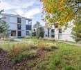 • Large multi-unit building, grey exterior, many windows, balconies on some floors, paved driveway