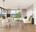 • open dining area, large windows, modern furniture, minimalist design, bright lighting, and kitchen visible in the background
