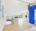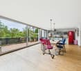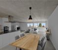 • modern open plan kitchen with dining area, balcony access, wooden ceiling, tiled floor, double glass doors