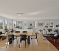 • Dining room, table with chairs, island with sink, kitchen cabinets, window with view, rug, hanging lamp, carpeted floor