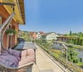 • ground floor entrance, kitchen, living room, dining room, bathroom, balcony, outdoor seating area, stairs to upper floor, bedroom, bedroom, bedroom, balcony, stairs