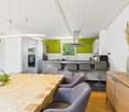 • Modern kitchen with white cabinetry, black countertops, built-in oven and dishwasher, a dining area with a table and chairs.