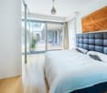 • Double bed with pillows, bedspread with fringes, floor lamp, nightstand with lamp, large windows, mirror wardrobe with glass door
