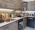 • washing machine, dryer, sink, mirror, shelves, glass door shower