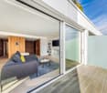 • Balcony with outdoor furniture and greenery overlooking a parking lot.