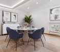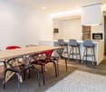 • open plan kitchen and dining area, modern kitchen with white cabinets, black granite countertops, island with bar seating, dining table and chairs, large clock, chandelier, tile flooring, neutral color scheme