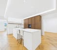 • Long corridor with white walls, wooden floor, large mirror, wooden counter, and modern style