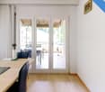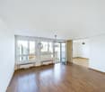 • Empty room with wooden floor, white walls, sliding glass doors, built-in kitchen, windows with a view