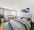 • white walls, white wooden floor, white bed, large window, view to the outside