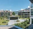 • A modern, multi-story apartment building with numerous balconies and terraces overlooking a scenic, rural landscape with rolling hills, trees, and traditional farm buildings in the background.