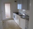 open plan living and kitchen, wooden floor, modern cabinets, open door to the bathroom