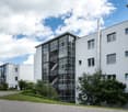 A modern, large, white building, with multiple floors and windows, it looks like an apartment building.