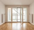 • Spacious open-plan living area with large windows, hardwood flooring, and a dining table. The room features a minimalist design with white walls and modern furniture. A balcony or terrace is visible through the windows, providing natural light and a poten