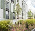 • Apartment building with multiple floors, red color, set in a green area with trees, mountains in the distance.