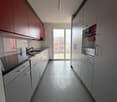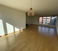 • Living room, dining area, open kitchen, TV, 4 chairs, sofa, table, rug, balcony