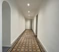 • wide arched windows with wooden frames, parquet floor, white walls, lamp, empty room