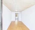• An empty hallway with white walls, wooden floor, and furniture including a couch, two chairs, and a radiator. There is an open door leading to another room, with a framed poster on the door and an item hanging on the door handle. There is another room vis