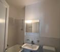 • Square bathroom, tiled floor and walls, shower, sink, toilet, no window