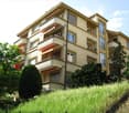 • Modern apartment building with multiple floors, glass balconies, and lush greenery.