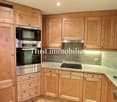 • kitchen with granite countertops, electric appliances, wooden table, two chairs, cupboards