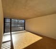 large room, wooden floors, sliding doors, balcony, distant building and mountain view