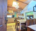 • Living room with sofa, coffee table, wooden staircase, TV, potted plants, round table, chairs, kitchen with kitchen appliances, light fixture, white rug