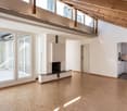 • Spacious open-plan living area with large windows, hardwood flooring, and a dining table. The room features a minimalist design with white walls and modern furniture. A balcony or terrace is visible through the windows, providing natural light and a poten