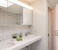 • modern bathroom, white ceramic floor, grey wall tiles, shower area with large glass door, silver faucets, white sink, white toilet