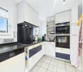 • modern open kitchen, round dining table, white kitchen cabinets, round ceiling light, large window, dishwasher