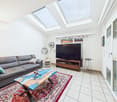 • modern attic room, white walls, tiled floor, wooden railing, large skylight