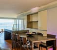 • Modern kitchen with island, granite countertops, built-in oven and refrigerator, under cabinet lighting, dining table, 6 chairs, modern pendant lights, large windows, wooden floor.