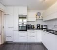 • Sleek white walls, sleek grey floors, modern lighting fixtures on the wall, glass sliding doors, kitchen area with a window