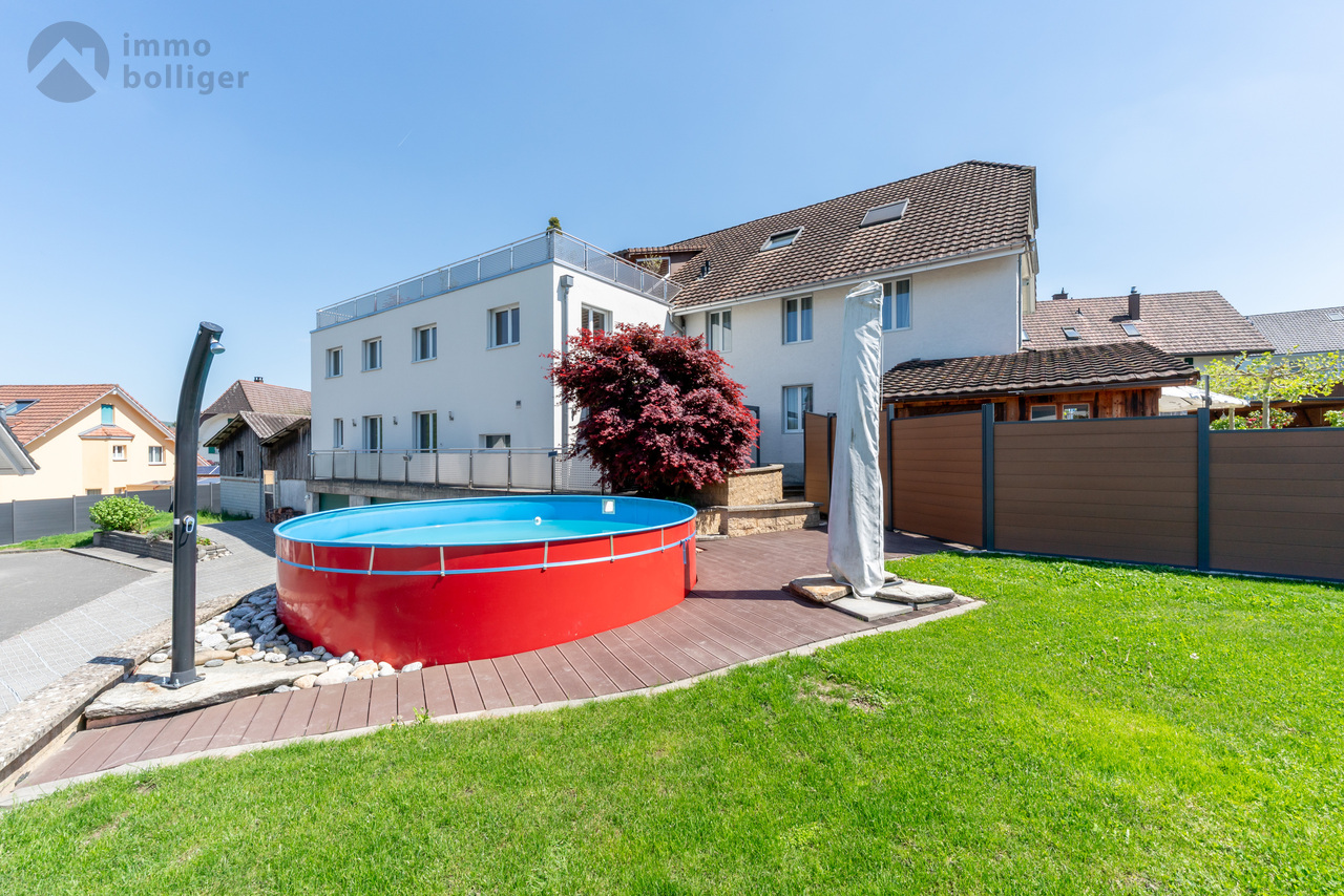 Leben, wo andere träumen - 9.5-Zimmer-Wohnung mit Pferdestall, Weide & Gartenparadies in Kienberg SOWohnen mit Seele, Raum & Möglichkeiten - ideal für Familien, Tierfreunde, Selbstversorger & FreigeisterAn der Anwilerstrasse 56 in Kienberg (SO) wartet eine wahre Wohnperle auf Menschen mit Vision - und einem Herzen für Natur, Tiere und echte Lebensqualität.Diese charmante 9.5-Zimmer-Wohnung im Erdgeschoss eines historischen Bauernhauses vereint auf rund 200 m² Wohnfläche zeitlosen Charakter mit modernem Wohnkomfort.Hinzu kommen beeindruckende ca. 890 m² vielseitig nutzbare Nebennutzflächen, darunter eine grosszügige Scheune mit Heuboden, Werkstatt, Bastelraum, Schopf, Keller- & Natur-/Weinkeller - ein Eldorado für Handwerker, Kreative und Menschen mit grossen Plänen.Die umfangreiche Infrastruktur für Tierhaltung, die idyllische Gartenlandschaft mit Obstbäumen, die angepachtete Weide mit Roundpen und der weite Blick ins Grüne machen diese Liegenschaft zu einem absoluten Ausnahmeobjekt, das in dieser Form nur selten zu finden ist.Hier treffen ländliche Idylle, handwerklicher Charakter und moderne Wohnkultur aufeinander - ideal für Familien, Selbstständige, Ruhesuchende oder kreative Köpfe mit Wunsch nach Platz und Freiheit.Highlights im Überblick: • Pferdestall mit Platz für 2 Pferde oder 2-3 Ponys • 2200 m² angepachtete Weidefläche mit Allwetter-Roundpen (Sandplatz) • Scheune mit Werkstatt, Heuboden, Unterständen & Maschinenplatz • Idyllischer Garten mit Obstbäumen, Laube & Naturblick • Top gepflegt & liebevoll renoviert: 2009-2023 • 15 Minuten nach Aarau, Frick oder Gelterkinden, ÖV-Anschluss via Bus • Stockwerkeigentum - geregelte Mitnutzung von Stall & Aussenflächen • Ideale Voraussetzungen für Tierhaltung, Homeoffice, Hobby & Naturgenuss Wohnen mit Charakter & KomfortDiese Wohnung verbindet rustikale Authentizität mit durchdachter Wohnqualität: • Helles Wohnzimmer mit Kachelofen und Parkett • Moderne Wohnküche (2020) mit BORA-Induktionsfeld • Essbereich mit Eckbank & freigelegter Bruchsteinmauer • 3-4 Schlafzimmer, flexibel als Büro, Gäste- oder Kinderzimmer nutzbar • Badezimmer mit Fussbodenheizung, Badewanne & begehbarer Dusche • Holz- & Schwedenöfen (einer wassergeführt), Naturkeller, Waschküche • Eigener Sitzplatz im Innenhof mit Zugang zu Stall und Garten • Heizung: Holzöfen, Elektrofussbodenheizung im Bad • Nebenkosten: Holz ca. CHF 1700/Jahr, Strom ca. CHF 1800/Jahr, Wasser ca. CHF 380/Jahr Tierhaltung & Selbstversorgung - einzigartiges PotenzialHier können Sie leben, was viele nur träumen: • Offenstall mit Tränke, Heuabwurf, Sattel- & Futterkammer, Hühnerstall • Roundpen (2023 ergänzt) direkt bei der Weide - mit Schattenplätzen • Werkstatt, Heuboden, Maschinenplatz - ideal für Hobby oder Gewerbe • Obstbäume, Gemüsegarten & Selbstversorgungsmöglichkeiten • Regelung aller Mitnutzungen über Stockwerkeigentum Interesse geweckt?...