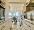 • Spacious kitchen with white cabinets, tiled backsplash, and a balcony with a view