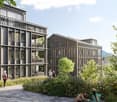 • Modern apartment building with green roofs, spacious landscaped garden, central walkway, beautiful mountain and lake view