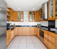 • Sliding glass doors leading to a balcony, modern kitchen design, grey tiled floor, white walls, panoramic windows