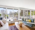 • modern design, large glass doors leading to balcony, wooden floor, white walls, decorative chandelier, cozy seating