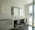 • Modern minimalist interior, hardwood floors, glass sliding doors to terrace, kitchen island, stainless steel appliances