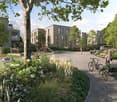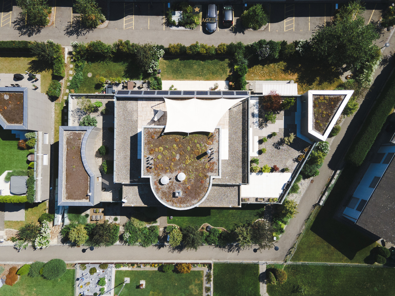 • Multi-story apartment building with solar panels on the roof, surrounded by residential houses and greenery, with a parking lot in the foreground