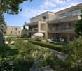 • modern building, multiple balconies, large green lawn in front, elevated area