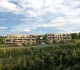 • Multi-story apartment building with a parking lot, surrounded by trees and greenery, with a scenic view of the countryside in the background.