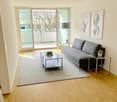 • Open concept living and dining area, kitchen, hardwood floor, large windows, balcony, modern furniture, artwork