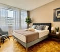 • Spacious bedroom with white walls, hardwood flooring, and a built-in closet system along the wall.