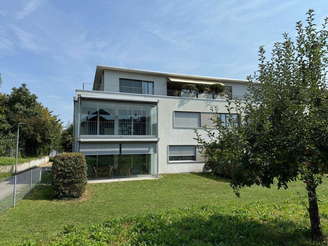 Moderne, lichtdurchflutete Gartenwohnung mit Morgen- und Abendsonne Die stilvolle Gartenwohnung überzeugt mit grosszügigen 210 m² Nettowohnfläche und einer optimalen Raumaufteilung, die nicht nur modernes Wohnen, sondern auch vielfältige Nutzungsmöglichkeiten bietet. Grosse Fensterfronten und ein helles Atrium bringen viel Tageslicht in die Wohnung. Lassen Sie sich von untenstehenden Vorteilen überzeugen: • 210 m² Nettowohnfläche verteilt auf 2.5 Zimmer • Helles, offenes Wohnkonzept mit grossen Fensterfronten • Flexible Raumaufteilung durch zwei separate Haupteingänge; ermöglicht die Nutzung als Therapie- oder Praxisräume sowie die Möglichkeit zwei Wohnungen zu schaffen • Das Atrium sorgt für reichlich Tageslicht und schafft eine freundliche Wohnatmosphäre • Offene und grosszügige Küche, verspricht Spass beim Kochen • Zwei komfortable Badezimmer mit insgesamt einer Dusche und Badewanne • Angenehmes Raumklima während allen Jahreszeiten • Insgesamt 140 m² Gartenflächen mit Morgen- und Abendsonne, davon 30 m² gedeckte Terrasse für Erholung und Entspannung • Vielfältiger Garten mit Blumen umrankter Pergola und Wildbeerensträucher • Viele Einbauschränke, ein geräumiges Réduit und ein grosser Kellerraum (23 m²) im Untergeschoss sorgen für genügend Stauraum • Zwei Einstellhallenplätze sind im Kaufpreis enthalten • Barrierefreier Zugang zu allen Wohnbereichen und Garten • Ruhige, naturnahe Lage mit optimaler Verkehrsanbindung • Kinderspielplatz und Spielwiese zur Mitbenützung Verpassen Sie nicht die Gelegenheit, diese exklusive Gartenwohnung zu erleben! Möchten Sie mehr Informationen? Bestellen Sie jetzt mit dem Kontaktformular die detaillierte Verkaufsdokumentation - wir freuen uns auf Ihre Kontaktaufnahme!