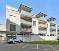 • Apartment building with four floors, yellow exterior, raised ground floor, multiple garages, green lawn